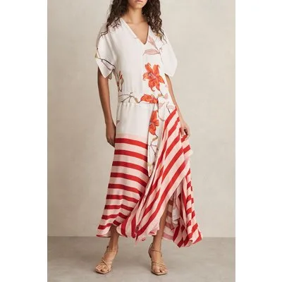 Reiss Floral Stripe Print Dress Ivory/red