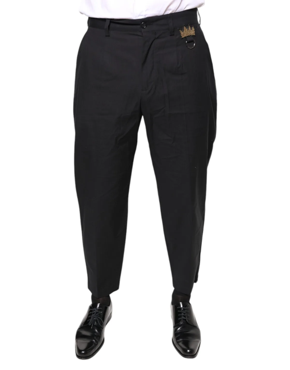 Trek de aandacht, straal zelfvertrouwen uit en herdefinieer je formele aanwezigheid. Deze zorgvuldig op maat gemaakte pantalon biedt ongeëvenaarde verfijning. Beleef het zelfvertrouwen van perfecte afwerking en een comfortabele pasvorm die de hele dag meegaat. De verfijnde zwarte stof zorgt voor een veelzijdige basis voor elke formele outfit. Het kenmerkende gouden kroondetail voegt een vleugje luxe toe en onderscheidt je met een verfijnde stijl. Perfect voor het sluiten van deals in de boardroom of het maken van een statement op chique evenementen, deze broek is jouw sleutel tot een wereld van sartoriale excellentie.