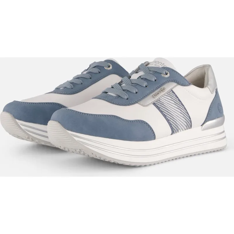 Remonte sneaker voor dames in een frisse combinatie van blauw en wit. Het model heeft sportieve panelen en een subtiel metallic detail, wat zorgt voor een eigentijdse uitstraling. Uitgevoerd in synthetisch materiaal met een textiele voering en een leren binnenzool. De G-leest biedt een normale pasvorm. Afgewerkt met vetersluiting en een rubberen loopzool voor comfortabel draaggemak.