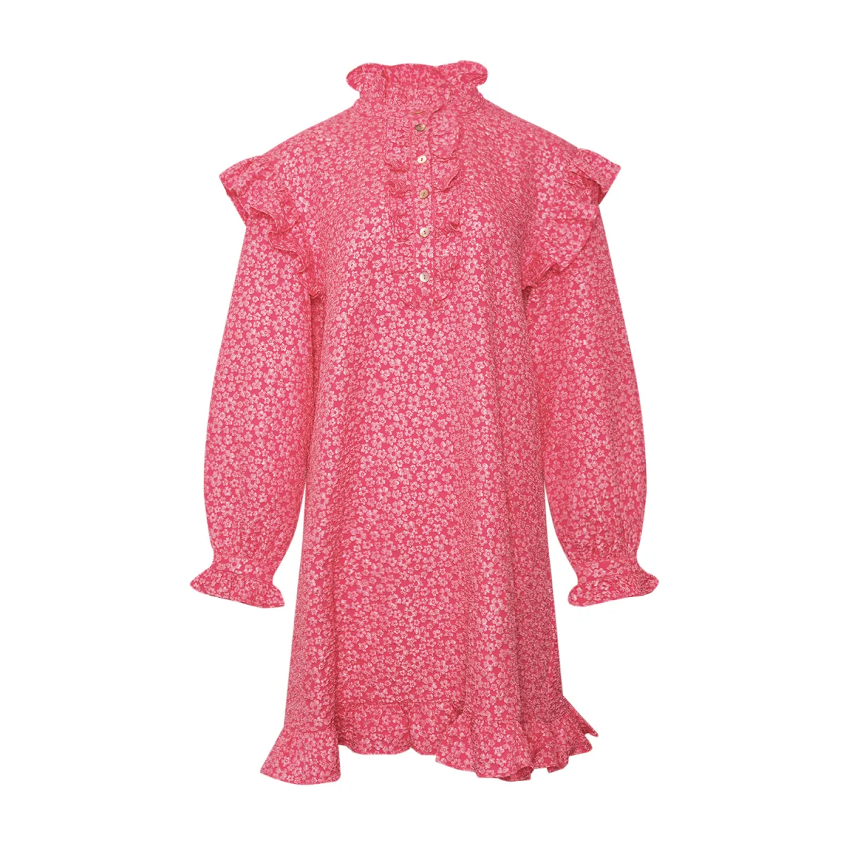 De Reno Ruby Ruffle Dress is een van onze populairste jurken. Hij heeft delicate ruches aan de mouwen en kraag, knoopjes op de borst en lange mouwen. De Reno Ruby Ruffle Dress is verkrijgbaar in diverse kleuren, texturen en prints.