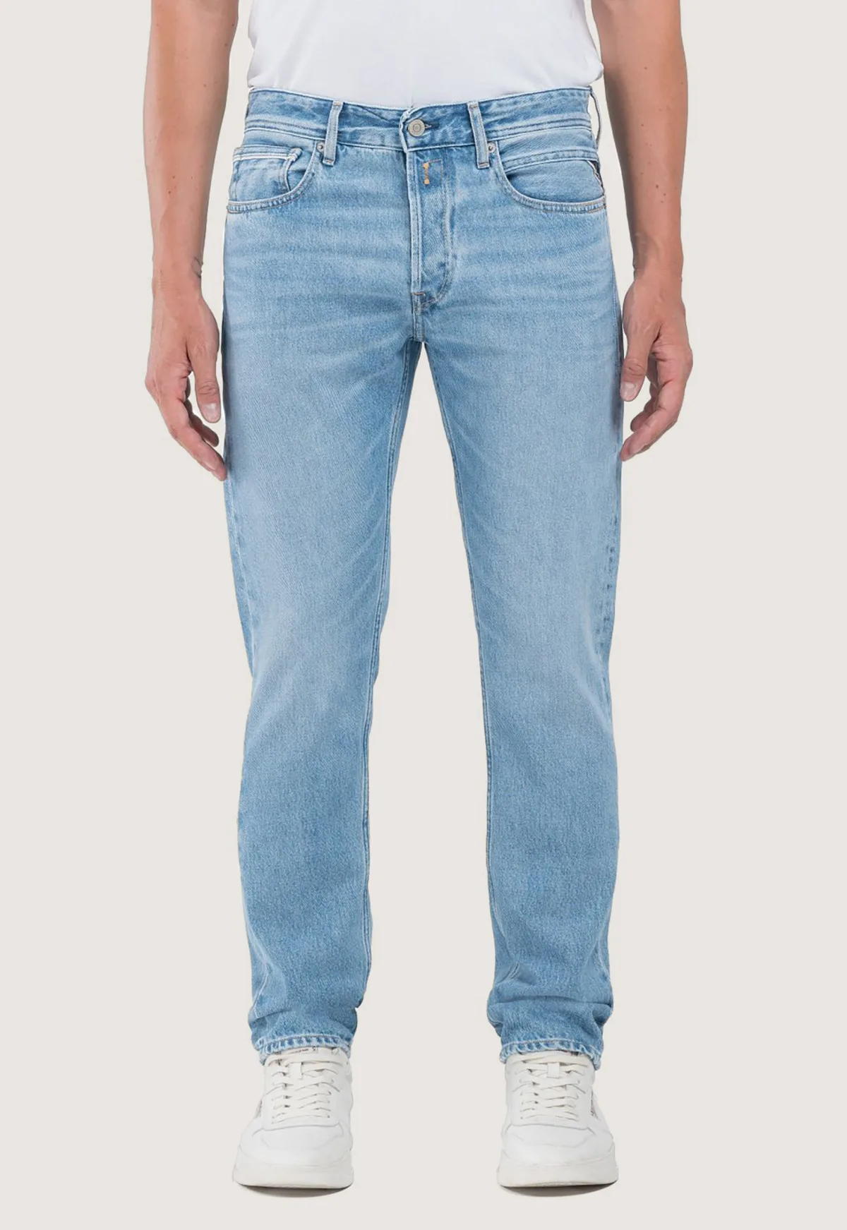 Dit is de MA972.886 Grover Straight Jeans van het merk Replay. De jeans is gemaakt van 100% katoen, heeft een straight fit, knoopsluiting en een 5-pocket design.