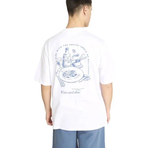 Dit heren T-shirt van Resteröds is uitgevoerd in wit katoen met een normale lengte en een ronde hals. Op de voorzijde staat een klein printje, terwijl de rug is afgewerkt met een Wine & Dine-print. De normale pasvorm maakt het een makkelijk te dragen op een jeans of korte broek voor een heldere, verzorgde look. Een rustige basis met een toffe print, voor een zelfverzekerde stijl.
