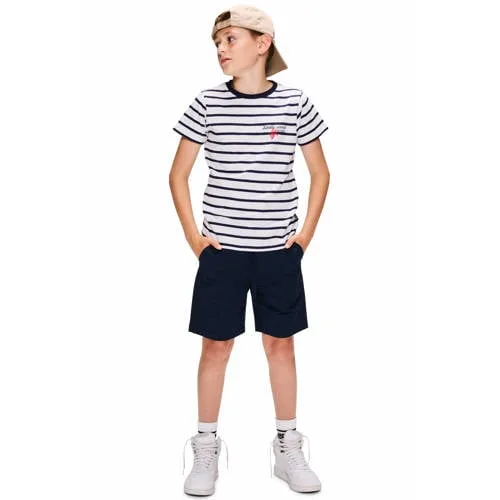 Voor actieve dagen op school of in de vakantie is deze donkerblauwe bermuda korte broek voor jongens van Retour Jeans een korte broek voor elke dag. De korte broek heeft de stijlnaam Paul en combineert een tijdloze effen kleur met een comfortabele pasvorm. Door de mix van 80% katoen en 20% linnen voelt de stof luchtig en soepel aan, geschikt voor warmere dagen.Comfort en details voor elke dag Gemaakt van 80% katoen en 20% linnen voor een lichte en ademende feel Regular pasvorm en regular waist voor een ontspannen, niet te strakke look Elastische tailleband met koord voor extra comfort en een goede aansluiting Verstelbare taille, zodat de broek met je kind kan meegroeien Voorzien van zakken voor, handig voor kleine spullen Effen donkerblauwe kleur die makkelijk combineert met T-shirts, polo's en hoodies Geschikt voor peuter, kleuter, schoolkind en tiener door de brede maatboogFijne broek voor dagelijkse outfitsDeze bermuda uit de Daily collectie van Retour Jeans is bedoeld voor alledaags gebruik. Van buitenspelen tot een dagje weg, de korte broek biedt bewegingsvrijheid en blijft dankzij de elastische tailleband goed op zijn plek zitten.Retour Jeans: kinderkleding met oog voor gemakRetour Jeans maakt kinderkleding met een ontspannen uitstraling. De ontwerpen sluiten aan op het leven van kinderen, met comfortabele pasvormen, praktische details en een herkenbare, eigentijdse stijl.Een korte broek die goed past bij warme, actieve dagen.