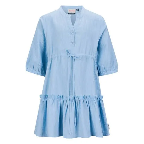 De lichtblauwe Retour Jeans meisjes jurk Candy is een luchtige midi jurk die meteen klaar is voor warme dagen en feestelijke momenten. De soepele stof van 100% polyester valt licht om het lichaam en beweegt makkelijk mee. Dankzij de V-hals en de striksluiting creëer je eenvoudig een pasvorm die goed aansluit, terwijl de speelse details deze jurk net even anders maken.Speelse details en comfortabel model Midi lengte voor extra bewegingsvrijheid tijdens spelen en dansen Driekwart ballonmouwen zorgen voor een luchtig gevoel rond de armen Ruches en volantdetails geven de jurk een speels en verfijnd karakter Striksluiting in de taille voor een verstelbare pasvorm V-hals die mooi openvalt zonder te diep te zijn Effen lichtblauwe kleur, makkelijk te combineren met sandalen, sneakers of laarsjes Gemaakt van 100% polyester, glad en vormvast, zodat de jurk mooi blijft vallen Geen zakken voor een rustige, zwierige look rondom de rokKlaar voor schooldag, feestje of familiedagDeze Candy jurk is geschikt voor allerlei momenten. Naar school met een vest en sneakers, of met sandalen naar een verjaardag, de lichtblauwe kleur en het zwierige model passen bij veel gelegenheden. De strik in de taille maakt het gemakkelijk om de jurk steeds weer fijn af te stellen.Retour Jeans voor eigentijdse kidsRetour Jeans staat bekend om kinderkleding met een stoere, moderne twist en een comfortabele pasvorm. De ontwerpen sluiten aan op wat kinderen graag dragen in het dagelijks leven en bij speciale momenten. Met deze Candy jurk kies je voor een doordacht ontwerp waar aan draaggemak en stijl is gedacht.Een veelzijdige jurk die haar garderobe meteen een frisse, lichte update geeft.