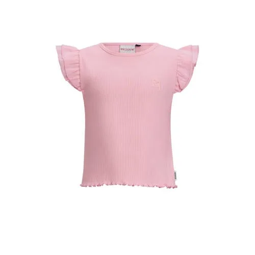 Dit lichtroze Retour Jeans T-shirt voor meisjes heeft een ronde hals en kapmouwtjes. Gemaakt van 100% katoen, het biedt rib gebreide details en ruches voor een speelse uitstraling. Perfect voor elke dag.