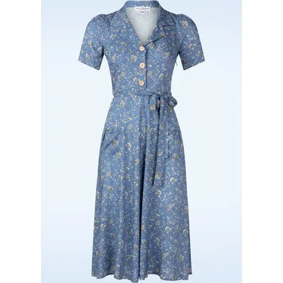 “Twist into vintage charm.” Voeg wat ’fourties flair’ toe aan je garderobe met deze Revers Antibes midi-jurk! Ze heeft een V-halslijn met een speels reverskraagje, korte pofmouwen en een reeks grote knopen. Het striklint accentueert je taille voor een supervrouwelijk silhouet, terwijl de opgenaaide zakjes aan de voorzijde zorgen voor een speelse touch. Uitgevoerd in een luchtige, soepelvallende EcoVero-viscose (stretcht niet) in blauw, voorzien van een lieflijke bloemenprint. * Semi-swing model * V-halslijn * Revers kraagje * Korte pofmouwen * Reeks knopen voorzijde * Afneembaar striklint, voor een extra 'snatched' taille * Zakjes voorzijde * Blinde rits aan de zijkant * Valt bij een lengte van 1,70 m halverwege de kuit