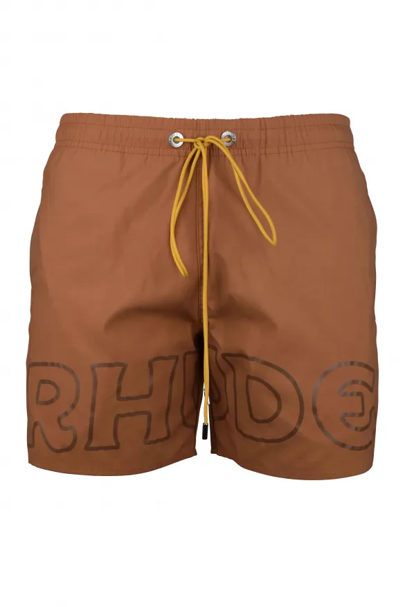 Rhudebruine nylon zwemshort.Donkerbruine logoprint op de voorkant.Elastische tailleband met gele trekkoorden.Zijzakken.Achterzak.