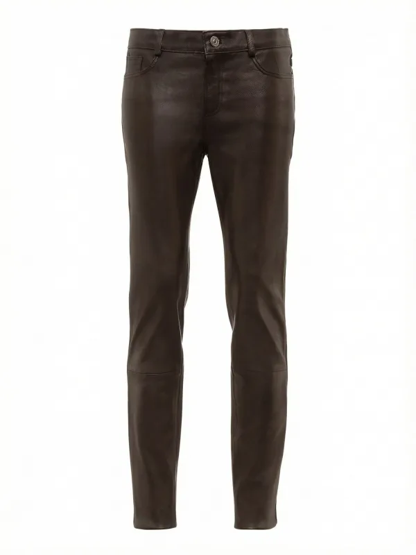 Design: Gevoerde zoom/rand, 5-pocket-style, Achterzak, Muntenzak, Zakken aan de zijkant; Type sluiting: Knoopsluiting; Materiaal: Leer; Motief: Effen; Extra's: Op staal naden, Gladde stof; Lengte: Lang/maxi; Pasvorm: Skinny; Taillehoogte: Mid waist