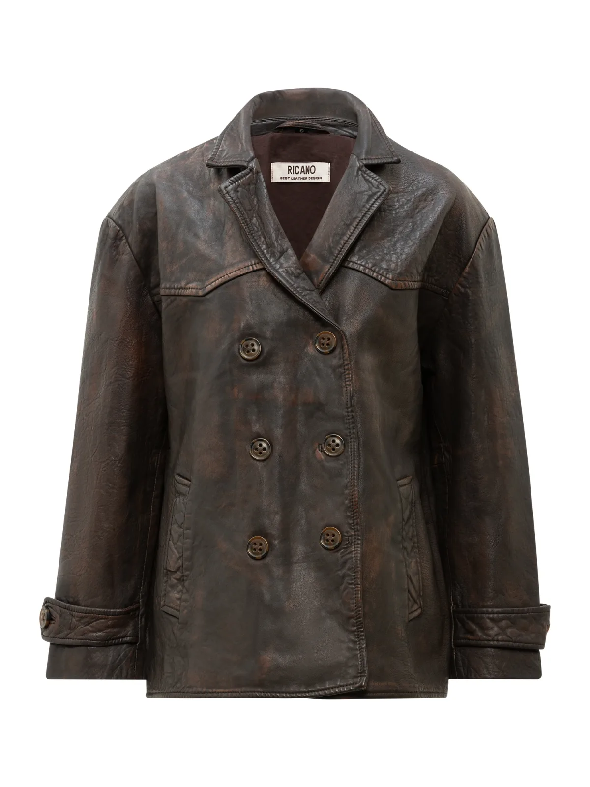 Design: Knop placket, Revers kraag, Zakken aan de zijkant; Type sluiting: Knoopsluiting; Voering: Licht gevoerd; Materiaal: Leer; Motief: Effen; Extra's: Op staal naden; Pasvorm: Losse pasvorm