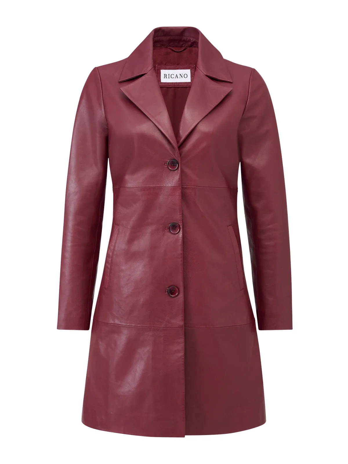 Type mantel: Klassieke mantel; Design: Knop placket, Revers kraag, Zakken aan de zijkant, Knop sluiting; Type sluiting: Knoopsluiting; Voering: Licht gevoerd; Materiaal: Leer; Motief: Effen; Extra's: Label patch/label flag, Op staal naden; Pasvorm: Slanke pasvorm; Lengte: Normale lengte