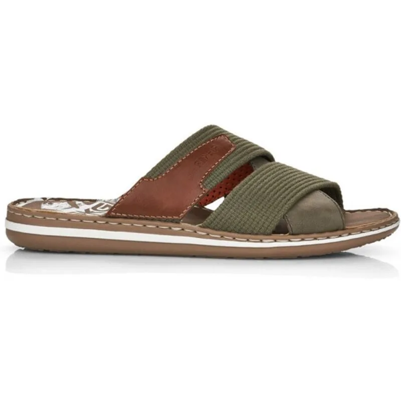 Artikel 21066 in kleur 54-Olive-Amaretto is een prachtige groene slipper, voor heren, van het merk Rieker. De zool is van rubber. De voering is textiel. De voetwijdte is G. Rieker is opgericht in 1874 in zuid Duitsland en was gelijk al een zeer succesvol merk. Inmiddels is het merk uitgegroeid tot een enorme schoenenfabrikant met het hoofdkantoor in Zwitserland. De schoenen staan bekend om het lichte gewicht, de flexibiliteit, de optimale schokdemping en hebben voldoende ruimte voor de tenen. Met de ruime collectie van schoenen en tassen speelt Rieker snel in op de mode trends van dit moment.