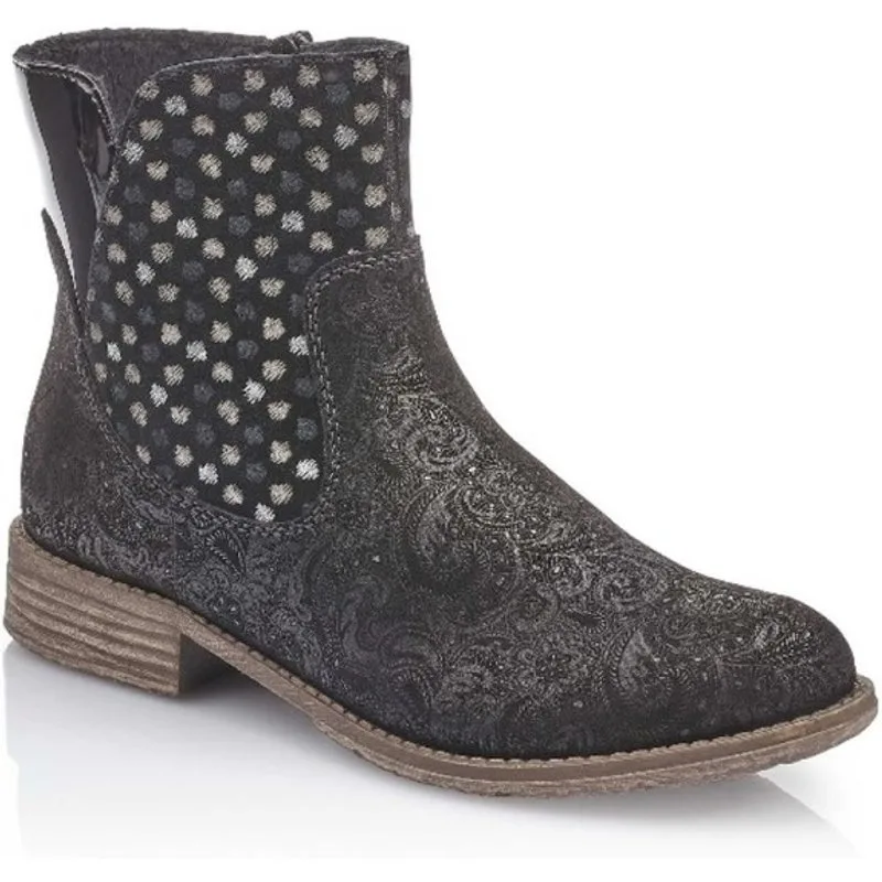 Enkellaarzen van het topmerk Rieker. Dit model is fantastisch afgewerkt met een geweldige print. Deze korte laarzen van Rieker, artikelnummer 74792