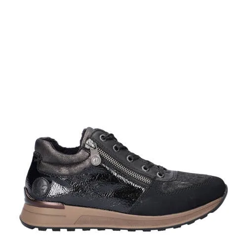 Deze Rieker sneaker heeft een lak buitenkant en een platte zool. De rits- en vetersluiting zorgt voor gemak. Met imitatiebont voering en een anti-stress voetbed voor extra comfort bij elke stap.