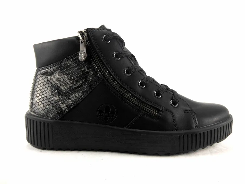 Halfhoge schoenen van het topmerk Rieker. Dit model is uitgevoerd in een mooie lak combinatie. Deze booties van Rieker, artikelnummer M6434
