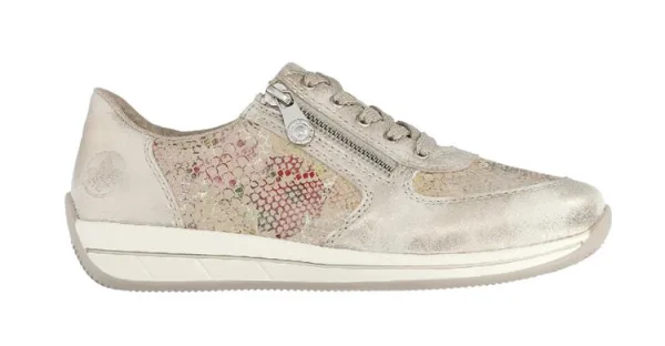 - Bij aboutyou.nl kun je Rieker Sneakers laag taupe / goud / lichtgroen / rood kopen voor slechts €59,90 , dat is 33% goedkoper dan bij Ziengs (€89,99).