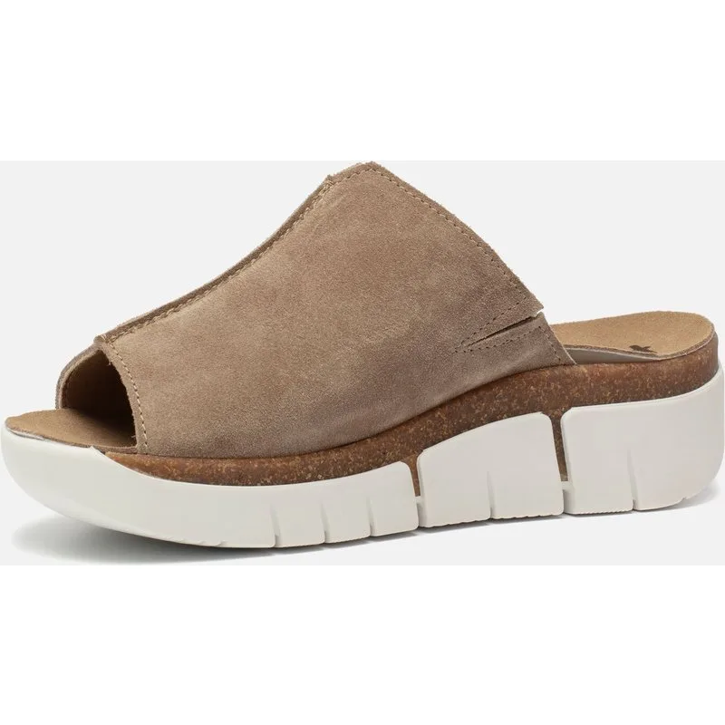 Deze taupe Feyn Muil Riva slippers zijn zomerse schoenen die jou gardarobe afmaken. De grote band is gemaakt van suede. Ter decoratie is er een groot stiksel in de as van de sandaal gemaakt. De voering van de band is gemaakt van synthetsiche materialen, net zoals de binnenzool. De tussenzool is gemaakt van kurkDe opvallende profielzool is gemaakt van rubber en heeft een hoogte van 5 centimeter.