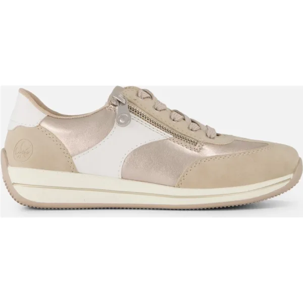Deze beige Rieker damessneaker is een comfortabele en veelzijdige keuze voor elke dag. De sneaker is uitgevoerd in een combinatie van verschillende materialen, wat zorgt voor een moderne en frisse uitstraling. De rits aan de zijkant maakt het aan- en uittrekken extra gemakkelijk, terwijl de veters zorgen voor een goede en verstelbare pasvorm. De lichtgewicht zool biedt prettige demping en ondersteuning bij iedere stap. Dankzij de zachte voering en het comfortabele voetbed loop je de hele dag ontspannen op deze Rieker sneakers.