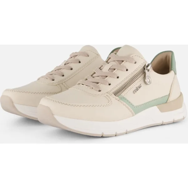Deze beige Rieker damessneaker combineert een frisse uitstraling met optimaal comfort. De sneaker is uitgevoerd in een mix van materialen en afgewerkt met subtiele mintgroene details voor een moderne look. Dankzij de combinatie van veters en een rits trek je de schoen gemakkelijk aan en uit en geniet je van een goede pasvorm. De lichtgewicht zool biedt fijne demping en ondersteuning tijdens het lopen. De zachte voering en het comfortabele voetbed maken deze sneaker ideaal voor dagelijks gebruik.