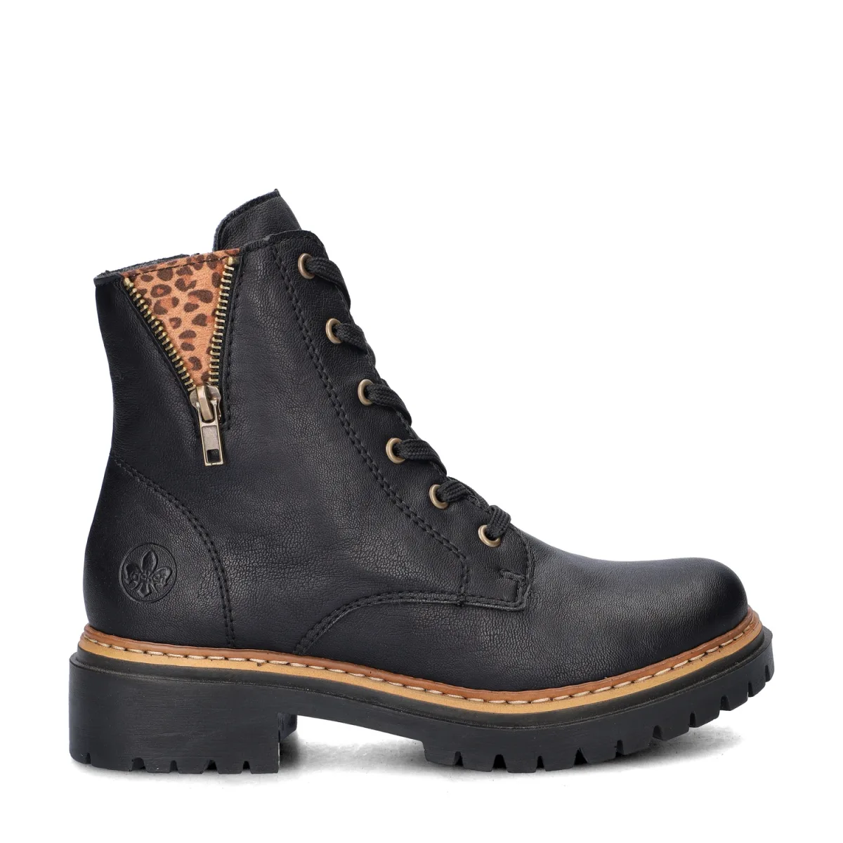 Rieker dames veterboot Een stoere veterboot hoort in iedere schoenencollectie. Goed te stijlen met een broek, rok of jurk, dus pefect als je opzoek bent naar veelzijdigheid. Uitgevoerd in imitatieleer met panter detail op de zijkant. Het materiaal voelt soepel aan voor een comfortabele pasvorm. Gevoerd met fake fur wat zorgt voor een comfortabel draaggevoel. Hierdoor zijn de boots geschikt voor de koudere maanden in het jaar. Voorzien van een Antistress-voetbed die lichte demping biedt tijdens het lopen. Afgewerkt met een lichtgewicht rubberen loopzool met grof profiel. Let op! De bruine variant met pied de poule print is gemaakt van textiel.