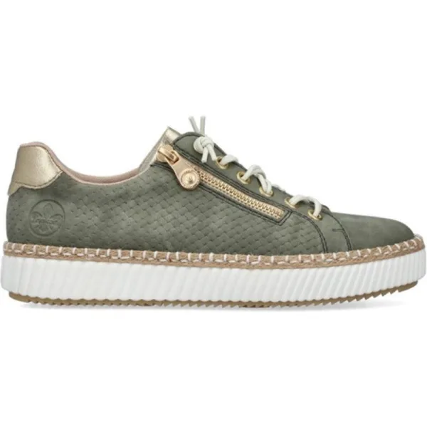 Artikel M2940 in kleur 52-Schilf-Lightgold is een prachtige groene veterschoen, voor dames, van het merk Rieker. De zool is van rubber. De voering is textiel. De voetwijdte is standaard. Deze veterschoen is voorzien van een uitneembaar voetbed. Rieker is opgericht in 1874 in zuid Duitsland en was gelijk al een zeer succesvol merk. Inmiddels is het merk uitgegroeid tot een enorme schoenenfabrikant met het hoofdkantoor in Zwitserland. De schoenen staan bekend om het lichte gewicht, de flexibiliteit, de optimale schokdemping en hebben voldoende ruimte voor de tenen. Met de ruime collectie van schoenen en tassen speelt Rieker snel in op de mode trends van dit moment.