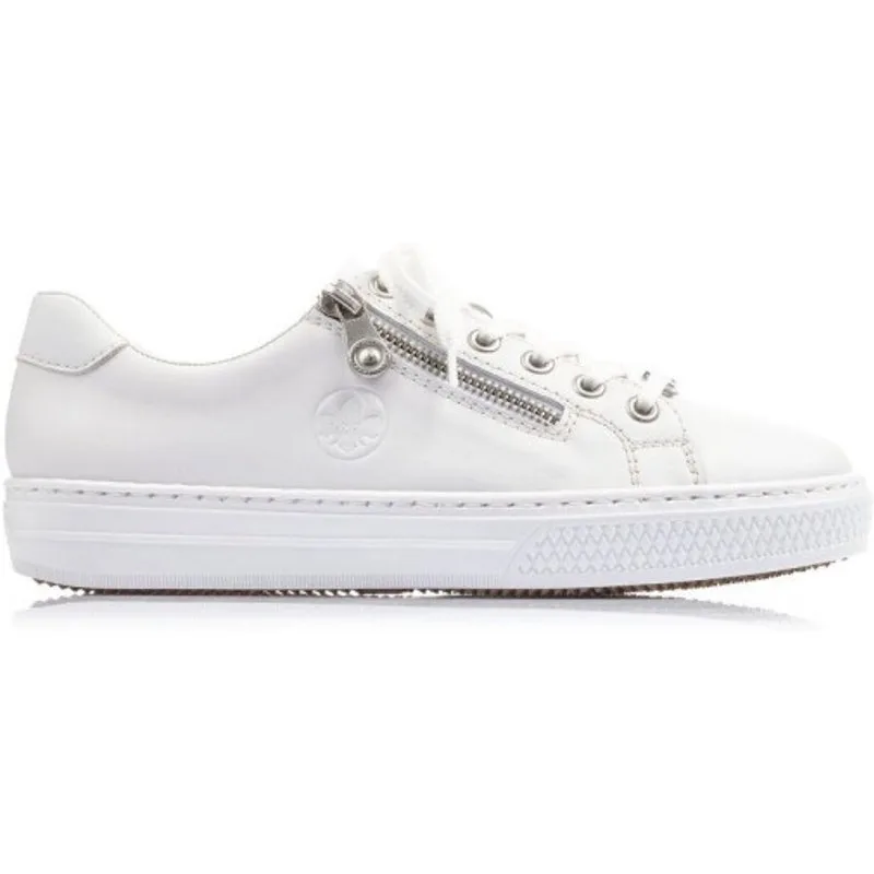 Artikel L59L1 in kleur 80-Wit/83Wit is een prachtige witte veterschoen, voor dames, van het merk Rieker. De zool is van rubber. De voering is textiel. De voetwijdte is standaard. Deze veterschoen is voorzien van een uitneembaar voetbed. Rieker is opgericht in 1874 in zuid Duitsland en was gelijk al een zeer succesvol merk. Inmiddels is het merk uitgegroeid tot een enorme schoenenfabrikant met het hoofdkantoor in Zwitserland. De schoenen staan bekend om het lichte gewicht, de flexibiliteit, de optimale schokdemping en hebben voldoende ruimte voor de tenen. Met de ruime collectie van schoenen en tassen speelt Rieker snel in op de mode trends van dit moment.