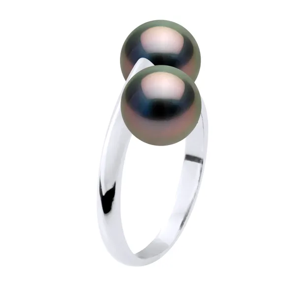 Ring You & Me - 2 Echte Gecultiveerde TAHITI Parel Ronde 8-9 mm - Zilver 925 Rhodium behandeld - Maat verstelbaar van Maat 48 tot Maat 62 - Geleverd in doos en met zijn Certificaat van Echtheid en Internationale Garantie - GEMAAKT IN FRANKRIJK
