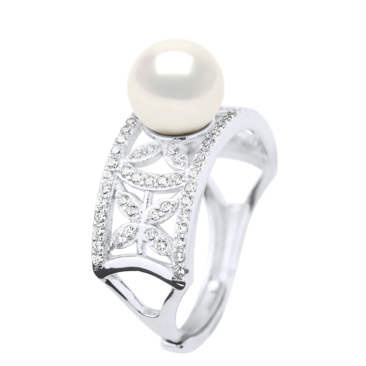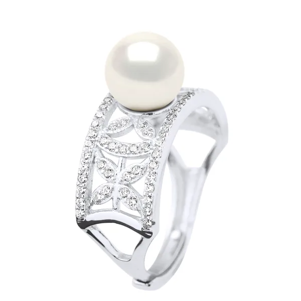 Ring Sieraden - Echte Gecultiveerde Zoetwaterparel Rond 8-9 mm - Sieraden Paving Cubic Zirconia Zilver 925 Rhodium gecoat - KLEUR NATUURLIJK WIT - Maat verstelbaar van Maat 48 tot Maat 62 - Geleverd in doos en met zijn Certificaat van Authenticiteit en Internationale Garantie - GEMAAKT IN FRANKRIJK