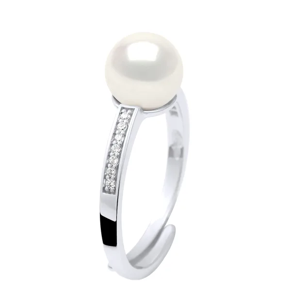 Ring Sieraden - Echte Gecultiveerde Zoetwaterparel Rond 7-8 mm - Sieraden Paving Cubic Zirconia Zilver 925 Rhodium vermeerd - KLEUR NATUURLIJK WIT - Verstelbare maat van maat 48 tot maat 62 - Geleverd in doos en met zijn Certificaat van Authenticiteit en Internationale Garantie - GEMAAKT IN FRANKRIJK