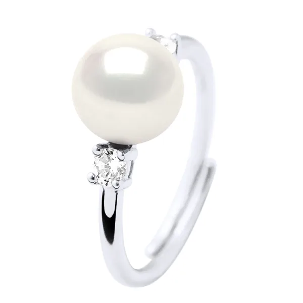 Ring Sieraden - Echte Gecreëerde Zoetwaterparel Rond 7-8 mm - Sieraad Solitaire Cubic Zirconia - Zilver 925 Rhodium geplated - KLEUR NATUURLIJK WIT - Maat aanpasbaar van Maat 48 tot Maat 62 - Geleverd in doos en met zijn Certificaat van Authenticiteit en Internationale Garantie - GEMAAKT IN FRANKRIJK