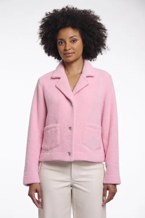 Deze korte damesjas van Rino & Pelle valt modern en recht. De zachte, bouclé-achtige kwaliteit voelt comfortabel en licht. De reverskraag en drukknoopsluiting geven een cleane look. Voorop zitten twee opgestikte zakken voor essentials. Het ontwerp is uni in een frisse roze tint, met subtiel logo-detail achterop en een klein knoopdetail aan de zoom. Categorie: Dames, Jassen en Jacks. Naam: Rino&Pelle Jack Bobien.7002621.