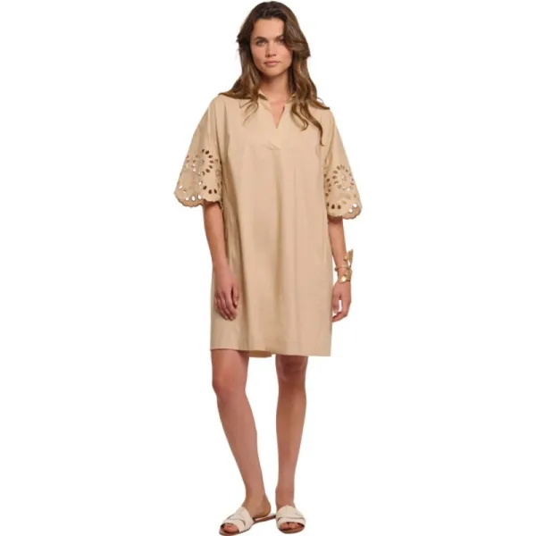 Deze beige zomerjurk van Rino & Pelle is uitgevoerd in katoen en heeft een lengte. tot boven de knie. Het wijdvallende model geeft de jurk een ruime pasvorm en een rustige, moderne uitstraling. De korte mouwen zijn afgewerkt met een broderie rand, wat het ontwerp een verfijnd detail geeft. De poplin katoenen uitvoering houdt de look helder en verzorgd. Mooi met sandalen voor een eenvoudige, stijlvolle combinatie.