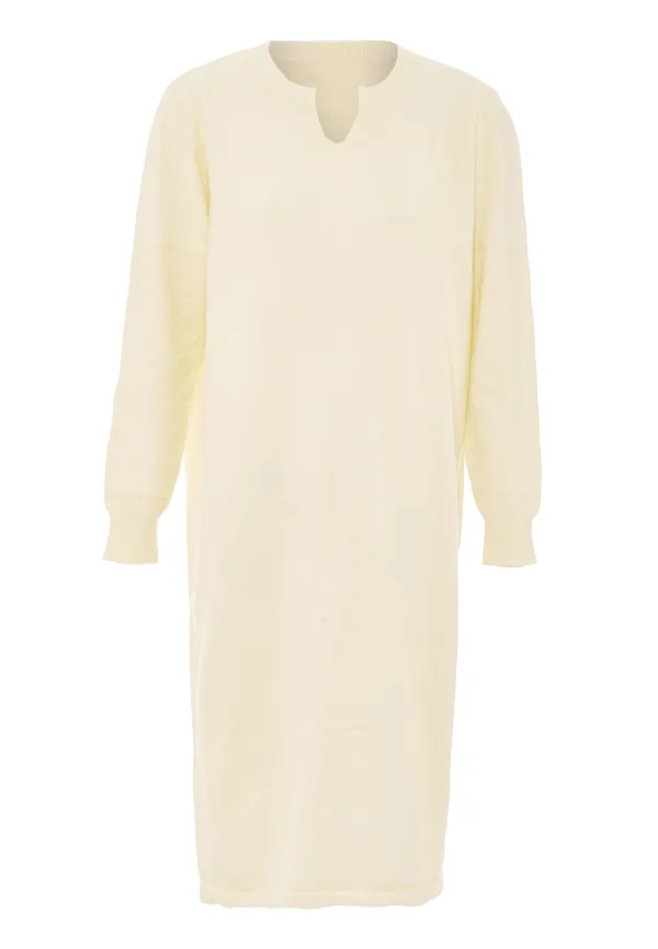 Met een ronde halslijn en een subtiele V-vormige uitsnijding valt dit kledingstuk met lange mouwen elegant tot aan de knieën. De ingezette mouwen zijn afgewerkt met manchetten bij de polsen, wat een vleugje elegantie toevoegt. Met een recht silhouet en een slanke zoomlijn straalt dit gebreide stuk stof moeiteloze stijl en comfort uit.