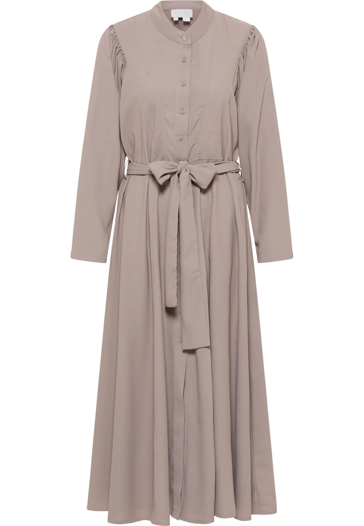 De puristische clean look die kenmerkend is voor het label RISA is ook terug te vinden in deze maxi-jurk. Deze elegante jurk van zacht, vloeiend materiaal met een kleine opstaande kraag en lange mouwen zorgt voor een elegant silhouet. De doorlopende knoopsluiting en de nauwsluitende tailleband geven het geheel een vrouwelijke touch. Draag met hoge hakken of fijne sneakers, afhankelijk van de gelegenheid.