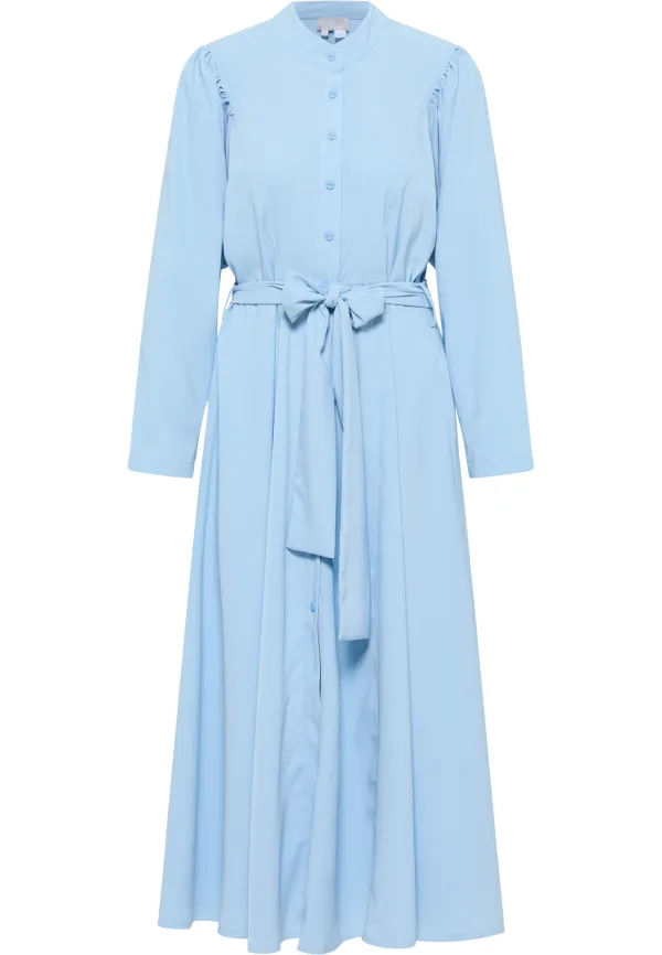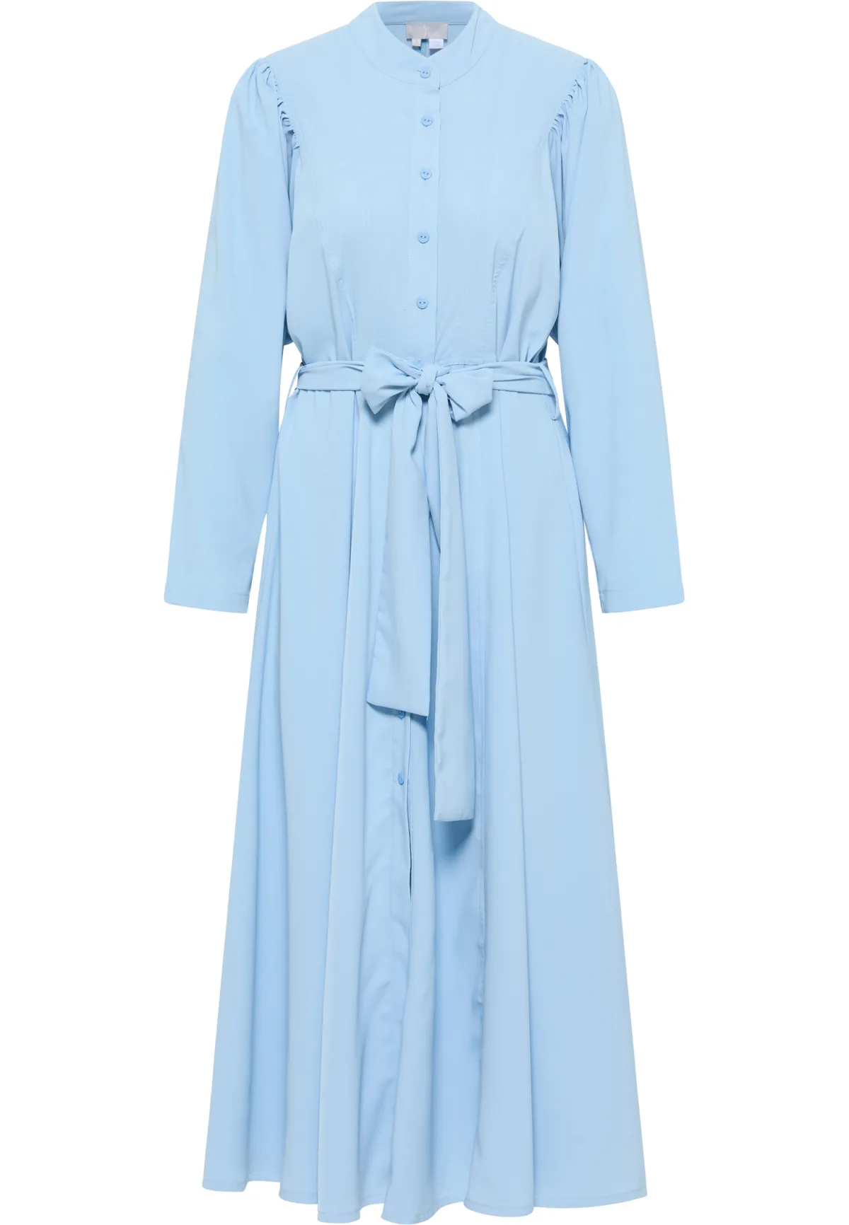 De puristische clean look die kenmerkend is voor het label RISA is ook terug te vinden in deze maxi-jurk. Deze elegante jurk van zacht, vloeiend materiaal met een kleine opstaande kraag en lange mouwen zorgt voor een elegant silhouet. De doorlopende knoopsluiting en de nauwsluitende tailleband geven het geheel een vrouwelijke touch. Draag met hoge hakken of fijne sneakers, afhankelijk van de gelegenheid.