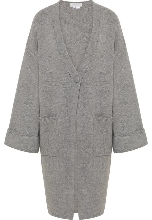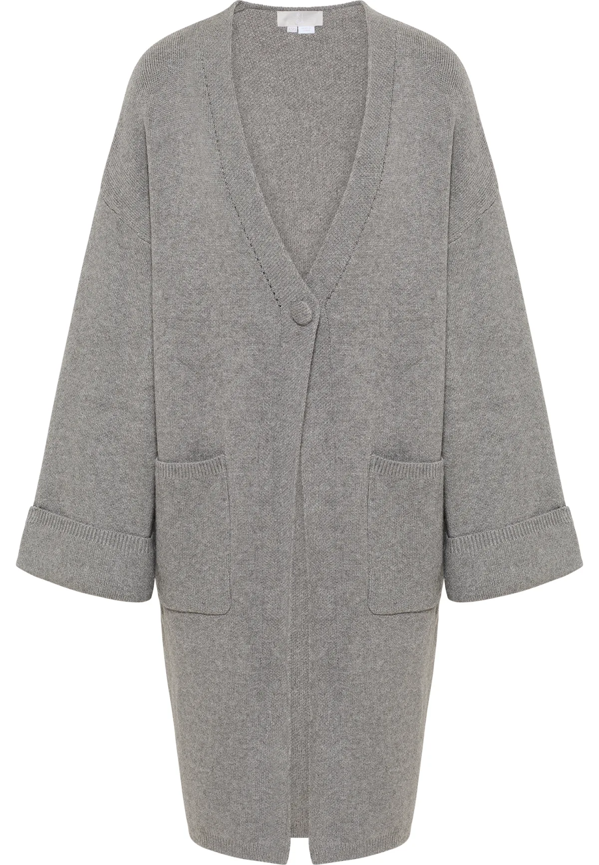 RISA toont een onmiskenbare flair voor minimalistisch design met dit lange vest. Het elegante maar geraffineerde oversized silhouet in een vrouwelijke grijze melange toont een nonchalant kimonokarakter. Twee opgestikte zakken, wijde mouwen en de met gebreide stof afgezette knoop ronden het model vakkundig af.