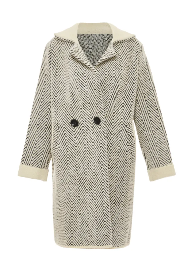 Deze jas is gemaakt met een opvallend structuurpatroon en straalt verfijning uit. Het heeft een brede reverskraag en een dubbele rij knopen, versierd met twee knopen, waardoor het een tijdloze uitstraling heeft. Het rechte silhouet, de lange mouwen met manchetten en praktische voorzakken maken hem zowel stijlvol als functioneel voor koelere klimaten. Ideaal om een vleugje warmte en elegantie toe te voegen aan je garderobe.