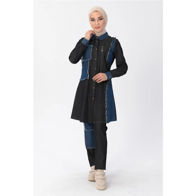 Rits Detail Hijab Denim Outfit Zwart Prijzen