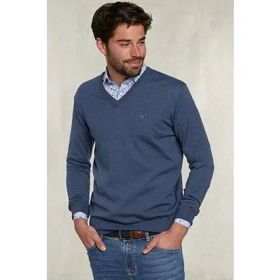 River Woods Basic Merino V-neck Pullover Steel Mix Blue