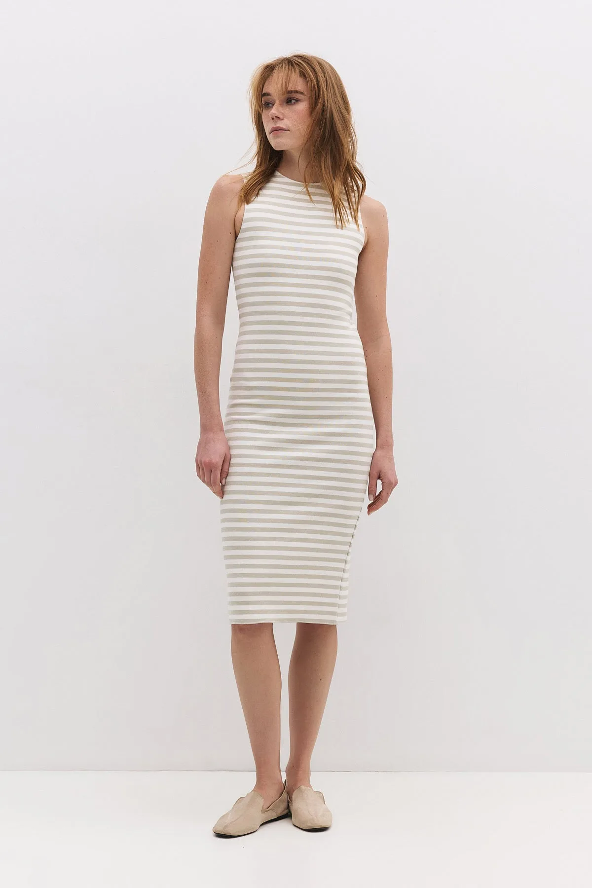 Design: Split; Materiaal: Jersey; Halstype: Ronde hals; Motief: Gestreept; Extra's: All-over patroon; Lengte: 3/4 lengte; Snit: Figuur omarmend; Pasvorm: Slanke pasvorm; Armlengte: Mouwloos