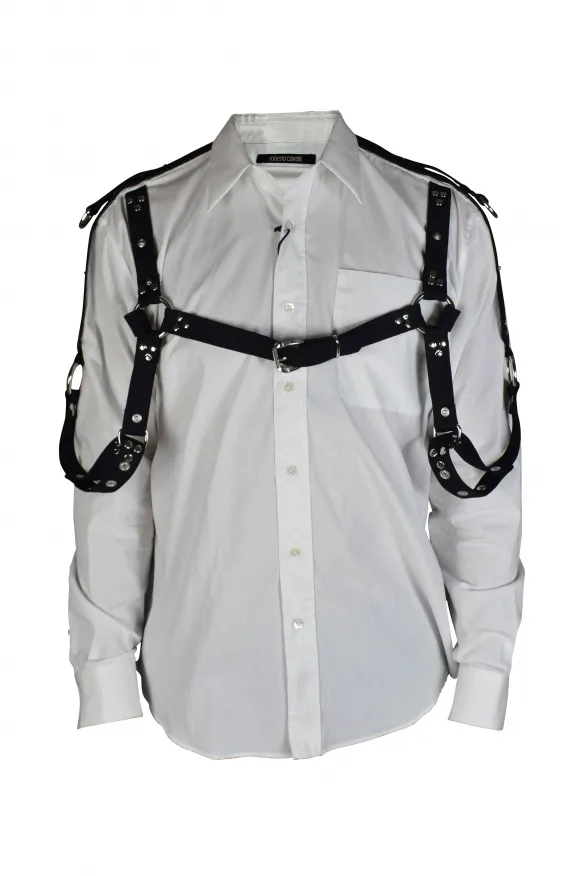 Roberto Cavalli wit overhemd in harnasstijl.Leren bandjes met zilveren metalen ringen en gesp.Klassieke puntkraag.Lange mouwen met manchetten met knopen.Opgezette borstzak.Logopatch op de nek.Knoopsluiting aan de voorkant.Gemaakt in Italië.