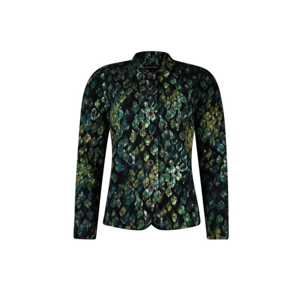 Dit kledingstuk past perfect binnen de huidige modetrends met zijn rijk gedetailleerde patroon. De groene tinten zijn een knipoog naar de natuurlijke elementen in de mode van dit seizoen. Combineer het met een simpel zwart rokje of een nette pantalon voor zowel casual als chique gelegenheden.