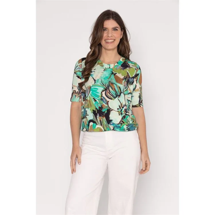 Dit T-Shirt van Roberto Sarto is uitgevoerd in een soepel vallende kwaliteit die comfortabel aanvoelt. Het heeft een ronde hals met subtiele V-inkeping, korte mouwen en een recht, regular-fit silhouet. Het pullover ontwerp zonder sluiting zorgt voor gemak. De all-over bloemenprint in tinten groen, turquoise, ecru, bruin en zwart geeft het kledingstuk karakter. Net afgewerkte zoom en mouwzomen maken het geheel verzorgd. Categorie: Dames, T-Shirts & Tops. Model: 611128-R1020.