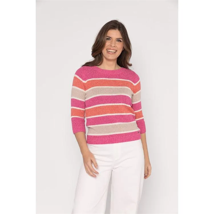 Deze trui is fijngebreid en voelt zacht aan. Het gestreepte dessin met brede banen in fuchsia, koraal, roze en lichtgrijs geeft een frisse look. De ronde hals en 3/4-mouw zorgen voor draaggemak het hele seizoen. De trui is een pullover zonder sluiting, afgewerkt met ribboorden langs hals, mouw en zoom. Als dames model valt het mooi aangesloten zonder te knellen. Een veelzijdige keuze binnen Dames, Truien & Vesten van Roberto Sarto.
