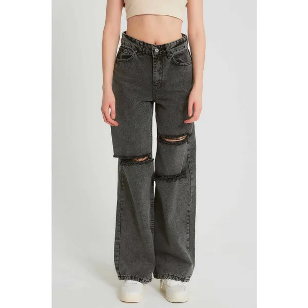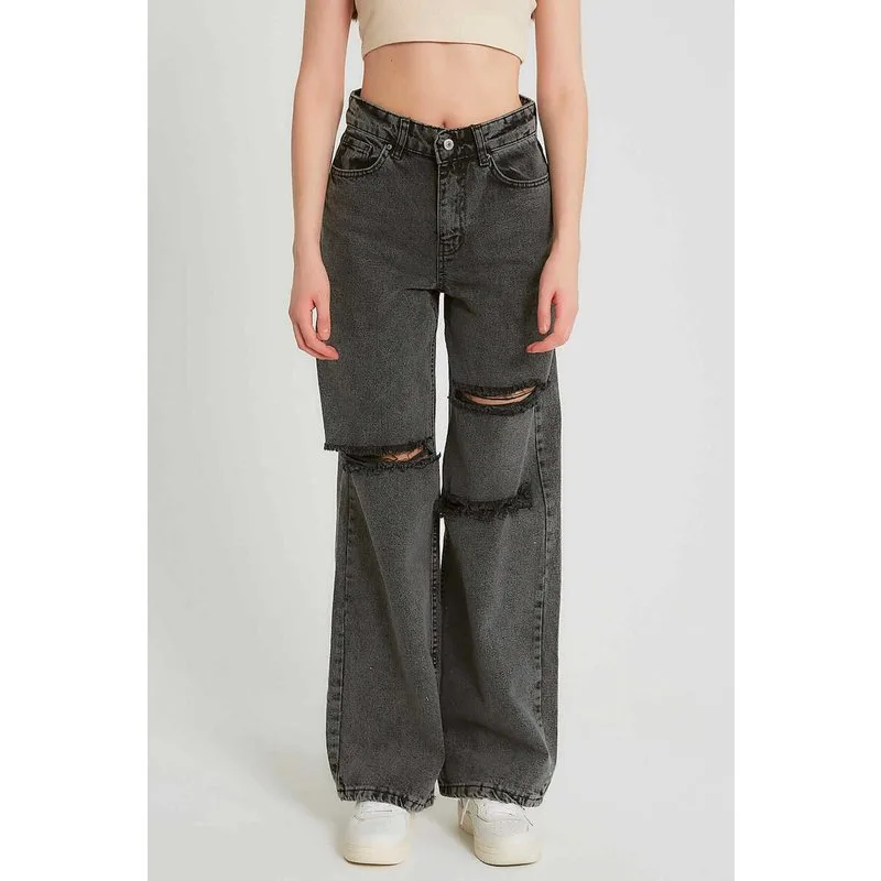 Basic Spijkerbroek High Waist - D83611 - Zwart/Grijs - Lichtblauwe spijkerbroek heeft een high waist model en een lichte wassing. Hij heeft rechte pijpen welke wijd vallen Deze jeans heeft een ritssluiting met enkele knoopsluiting