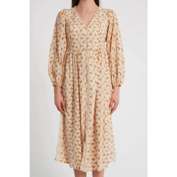 Dames Broderie Jurk - M34891 - Camel - Dames broderie print jurk Hij heeft lange mouwen en een v-hals Het martiaal bestaat uit 100% Katoen