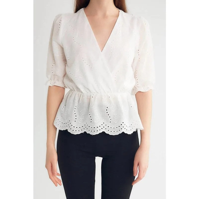 Dames Broderie Overhemd - M34867 - Wit - Dames broderie overhemd Hij heeft korte mouwen en een v-hals De mouwen hebben aan het uiteinde een knoopje zodat je ze eventueel ook op kan rollen.