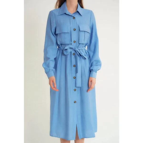 Dames Blanco Lange Jurk - M34769 - Blauw - Dames blanco lange jurk Hij heeft lange mouwen en een kraagje. De mouwen hebben aan het uiteinde een knoopje zodat je ze eventueel ook op kan rollen. Heeft elke zijde een lusje waar je eventueel de meegeleverde tailleband (riem) doorheen kan halen Het martiaal bestaat uit 100% polyester.