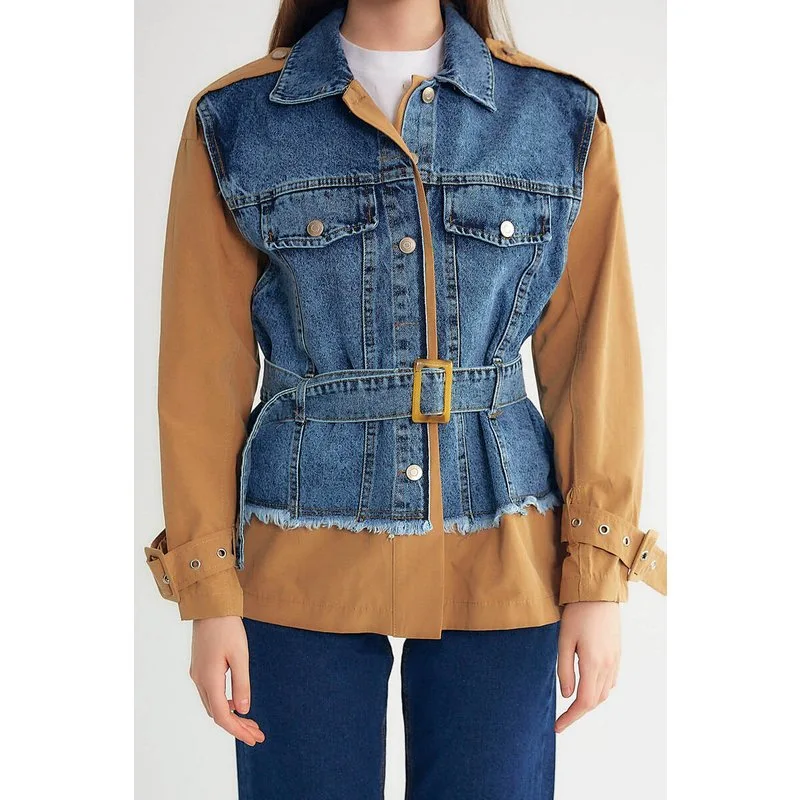 Dames Spijker Jas - D89776 - Blauw /Bruin - Dames oversized spijker jas met riem en knoop sluiting. Hij heeft lange mouwen en een kraagje. Het martiaal bestaat uit twee stof soorten. Materiaal bestaat uit 100% polyester.