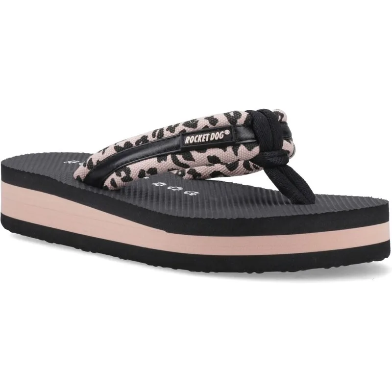 De Rocket Dog Monica Lichtroze Luipaardprint Flip-Flop is een dames platformstijl met een nylon stoffen luipaardband, stoffen voering en een zwart en tan EVA platform onderkant van ongeveer 3 cm.