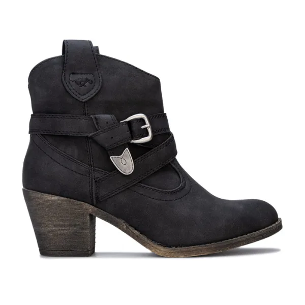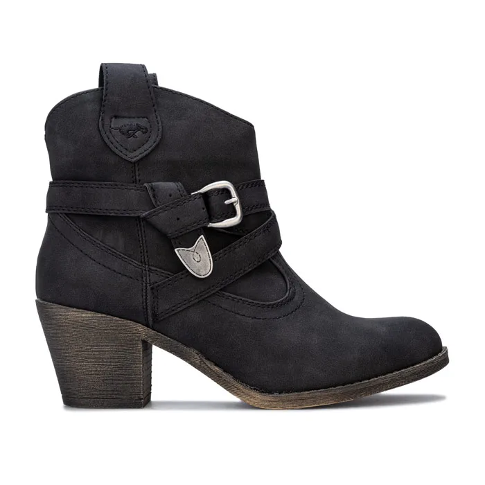 Womens Rocket Dog Satire Lane Boots in Black.- Faux leather western style boot.- Comfortable lining to inner collar.- Almond shaped toe.- Ankle strap and buckle detail.- Side pull-on tabs.- Rocket Dog branding to side.- Heel height 2.75in (7cm) approximately.- Boot height 3.75in (9.5cm) approximately (back measurement).- Synthetic upper Textile lining Synthetic sole.- Ref: SATIRELANE